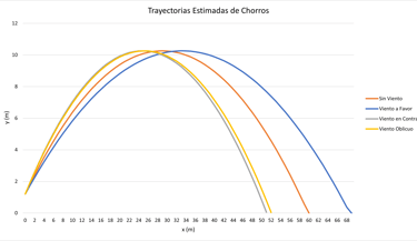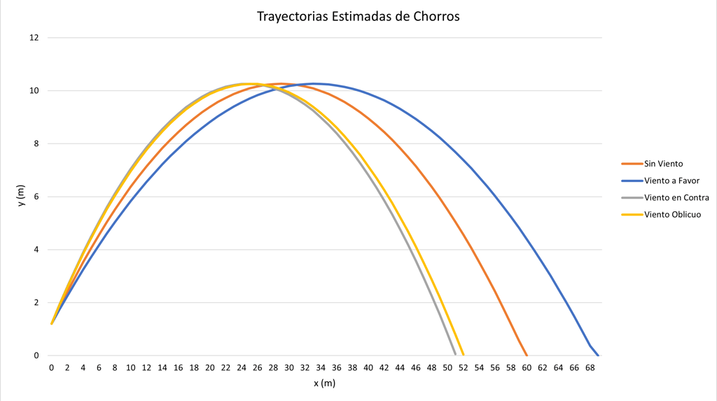En este modelo balístico simplificado, la altura máxima del chorro no se ve afectada por la presencia de viento paralelo. Esto se debe a que el viento actúa únicamente sobre la componente horizontal de la velocidad, mientras que el movimiento vertical permanece gobernado exclusivamente por la aceleración de la gravedad. Esta condición constituye una hipótesis del modelo adoptado.